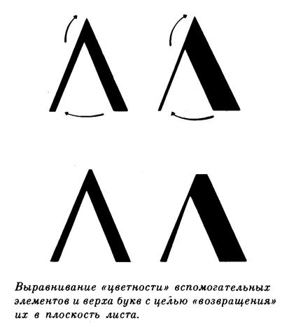 В жирных рубленых шрифтах надо слегка обуживать штрихи, приводя их к трапециевидной форме, так как в местах соединения штрихов образуются слишком перенасыщенные пятна.