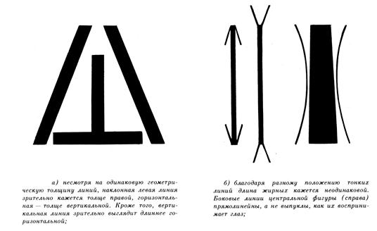 Здесь, как и в предыдущих и последующих примерах, геометрическая пропорциональность элементов букв направлена на удовлетворение психофизиологии человеческого зрения, на исправление оптических иллюзий, ошибок нашей зрительной системы. Поэтому понятия геометрической и оптической пропорциональности в шрифте тесно взаимосвязаны; соблюдение одного условия подразумевает изменения в другом. Прежде чем идти дальше, сделаем небольшое отступление. Взгляните на эти рисунки.