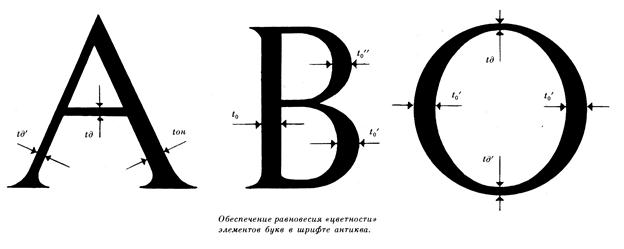 Равновесие цветности в буквах зависит от цветности основных прямолинейных (t0), округлых (t0’ t0”) и наклонных (t о.н.) штрихов. Максимальная толщина наплывов в округлых элементах должна быть несколько большей, чем у прямых, потому что цветность прямолинейного штриха количественно больше, так как приходится на всю длину штриха; округлый же элемент в контрастных буквах имеет максимум цветности на небольшом отрезке и по мере утоньщения теряет её. Толщина основного вертикального штриха чуть больше толщины основного наклонного (t0>to.н.). Существуют и другие нюансы в рисовании шрифта. Так, например, в букве В максимальная толщина верхнего наплыва (t0") больше или равна толщине основного штриха (t0), но меньше наплыва нижнего (t0'), что придает нижней (базовой) части больший вес. Зрительная устойчивость букв повышается благодаря различию толщины в дополнительных штрихах: верхние дополнительные штрихи могут быть чуть тоньше нижних (td'>td). Наклонные штрихи, как в букве А, чуть толще горизонтальных (td'>td). Это обеспечивает зрительное равенство толщин дополнительных штрихов. Надо помнить о том, что прямая одной и той же толщины в вертикальном, горизонтальном и наклонном положении воспринимается неодинаковой по толщине.