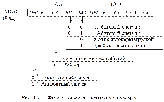 При работе в качестве счетчика событий содержимое Т/С инкрементируется под воздействием перехода из 1 в 0 внешнего входного сигнала, подаваемого на входы Т0 (Р3.4) или Т1 (Р3.5). Для управления режимами работы Т/С и организации взаимодействия таймеров с системой прерывания используются регистры TMOD (рис. 4.1) и TCON (табл. 4.1). С помощью битов М1 и М0 задаются четыре возможных режима работы Т/С0 и Т/С1.