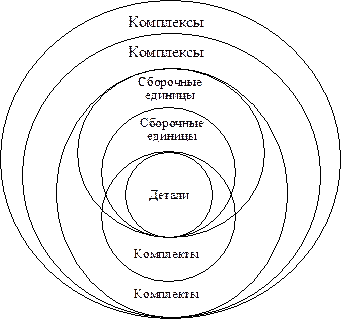Исходным (нулевым) уровнем S0 сборочных единиц являются детали. В состав сборочной единицы первого уровня S1 входят только детали. К второму и последующим уровням сложности относятся сборочные единицы всех предшествующих уровней, включая детали. С этих позиций понятия «комплект» и «сборочная единица» становятся равноценными, поскольку и те и другие состоят из деталей и сборочных единиц разных уровней сложности.