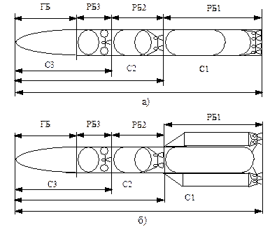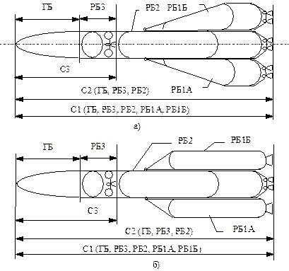 а – все ракетные блоки жидкостные; б – ракетные блоки РБ1А и РБ1Б твердотопливные