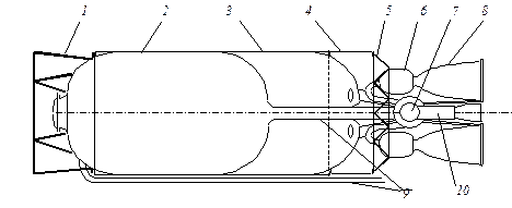 – жидкостных ракетных двигателей, включающих камеру сгорания 6 с соплом 8, турбонасосный агрегат (ТНА) 7, газогенератор ТНА 10, ферму 5, связывающую элементы жидкостного ракетного двигателя друг с другом и корпусом, элементы системы управления двигательной установкой.