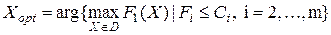 Существует один, часто применяемый способ свести многокритериальную задачу к однокритериальной – это выделить один (главный, основной) критерий F1 и стремиться его обратить в максимум (минимум), а на остальные F2, F3,.. Fm частные критерии наложить только некоторые ограничения, потребовав, чтобы они были не меньше (больше) каких-то заданных величин. Таким образом, идея метода главного критерия заключается в том, что частные критерии обычно неравнозначны между собой (одни из них более важны, чем другие) и это позволяет выделит главный критерий, а остальные (критерии) рассматривать как дополнительные, сопутствующие. Например, при оптимизации плана работы предприятия можно потребовать, чтобы прибыль была максимальна, план по ассортименту – выполнен или перевыполнен, а себестоимость продукции – не выше заданной. При таком подходе все показатели, кроме одного – главного, переводятся в разряд ограничений. Такое различие позволяет сформулировать задачу многокритериальной оптимизации как задачу нахождения условного экстремума основного (главного) критерия: