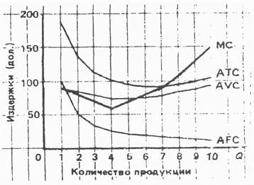 Сложнее зависимость переменных издержек в функции роста производства. На первом этапе кривая AVC показывает уменьшение удельных переменных издержек: сказывается эффект масштаба, увеличения объема производства. Но затем удельные переменные издержки начинают расти: над эффектом масштаба берет верх действие закона убывающей отдачи. Например, на машиностроительном предприятии работа в три полных смены может привести к снижению отдачи оборудования, так как выпуск продукции в третью смену исключает возможность профилактических работ, что неизбежно приведет к простоям машин и оборудования. Что касается кривой совокупных издержек (АТС), то она падает быстрее, чем каждая из ее составляющих (AFC и AVC), что вполне закономерно.