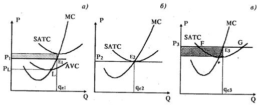 Рис. 34а соответствует ситуации, когда рыночная цена ниже средних суммарных издержек в точке равновесия Е 1. В этом случае фирма несет убытки, величина которых оценивается заштрихованной областью. Объем Qe1 определяет величину выпуска, при котором фирма скорее не максимизирует прибыль, а минимизирует потери. Согласно правилу 1, фирма должна продолжать производство, т.к. Р> AVC и она покрывает все переменные и часть постоянных издержек. Однако ей не следует заменять износившееся капитальное оборудование, а целесообразно по мере износа капитальных ресурсов сворачивать производство. Если цена товара понизится до РL, то в случае дальнейшего падения цены товара фирма должна прекратить производство и ликвидироваться, т.к. Р < AVC и не выполняется правило 1. В этой связи точку L зачастую называют точкой закрытия фирмы (shutdown, close-down point).