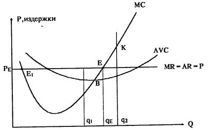 Производя Qe единиц товара, когда МС=Р, фирма максимизирует прибыль, и любые отклонения от этого объема уменьшают прибыль фирмы. Если фирма будет выпускать Q1<Qe единиц товара, то цена товара (которая не меняется) станет превосходить предельные издержки, фирма обязана в этих условиях увеличить производство, иначе она не максимизирует прибыль. Когда же Q2 > Qe, то предельные издержки начинают превосходить цену, фирме необходимо снизить объемы выпуска.