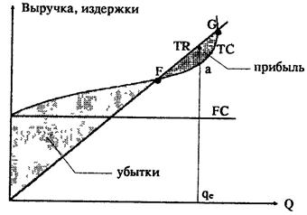 Фирма максимизирует прибыль, выпуская Qe единиц товара, когда линия TR отстоит от кривой ТС на максимальную величину. Тангенс угла наклона прямой TR равен цене Р; в точке а кривой ТС тангенс угла наклона касательной равен также Р: d(TC)/dq=MC=P.