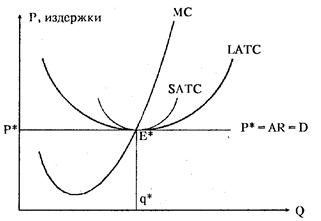 Когда все фирмы отрасли имеют объемы производства, соответствующие минимуму их средних издержек в долгосрочном периоде (величина минимального значения LATС для всех фирм отрасли одинакова и равняется цене товара, а объемы производства и очертания кривых LATC могут отличаться) отрасль находится в равновесии. Поскольку МС = Р то ни одна из фирм не в состоянии увеличить прибыль, варьируя объемы производства в краткосрочном периоде. Минимумы кривых SATC и LATC и равенство средних суммарных издержек цене показывает, что получаемая выручка полностью покрывает издержки упущенных возможностей фирм и прибыль каждой фирмы равняется нулю. В этой связи ни одна новая фирма не входит в отрасль. Следовательно, при заданном уровне технологии и неизменных ценах ресурсов фирма минимизирует издержки производства, выпуская товар на уровне, соответствующем точке равновесия в долгосрочном периоде.