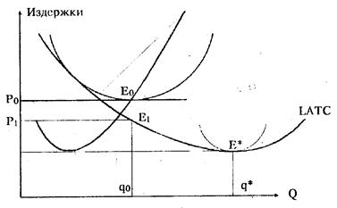 Действуя в краткосрочном периоде, фирма уравняла средние суммарные издержки с ценой товара и выпускает qо единиц товара. Однако у нее имеются резервы снижения AТС путем расширения масштабов производства: увеличив размеры капитала, она может производить qо единиц товара с меньшими издержками на единицу продукции и получать прибыль (соответствует точке Е1). Но это вызовет экспансию капитала, увеличит предложение товара, что приведет к падению его цены (до величины P1). Процесс входа новых фирм в отрасль прекратится в точке E* - глобального минимума.