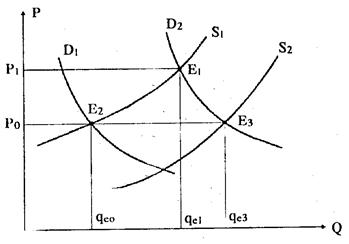 Первоначально на рынке устанавливается цена Р o, которая определяется пересечением кривой предложения S1 отрасли (в краткосрочном периоде) и рыночной кривой спроса D1. Производя Qeo единиц товара, фирмы всей отрасли находятся в долгосрочном равновесии. Пусть под воздействием каких-то факторов спрос на товар возрос и кривая спроса переместилась в положение D2. Это приводит к увеличению равновесной цены до Р1 . Однако возможность получать прибыль вызовет экспансию капитала в отрасль, что повлечет рост предложения до величины S2. Поскольку цены ресурсов не меняются, то в точке Е 3 вновь установится цена Ро, равная суммарным средним издержкам, и каждая фирма начнет получать нулевую прибыль, следовательно, в отрасли вновь наступит равновесие.