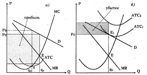 Как видно из рис.40а и 406, фирма производит такой объем товара Qe, когда MR=МС. Цена Ре при этом определяется соответствующей точкой на кривой спроса D. Если цена Ре превосходит средние суммарные издержки, т.е. находится выше кривой АТС (рис.20 а), то фирма получает прибыль, равную заштрихованному прямоугольнику. В том случае, если средние суммарные издержки при выпуске Qe товаров равны цене (кривая ATC1 на рис.40 б), фирма полностью покрывает издержки упущенных возможностей и имеет нулевую прибыль. Когда суммарные издержки на единицу продукции превосходят цену (кривая АТС 2 на рис.40б), фирма-монополист несет убытки (заштрихованная область).