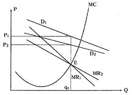 Если спрос на товар определяется кривой D1, то фирма максимизирует прибыль, производя qe единиц товара, когда МС=MR1. При этом установится цена Р1 . Когда же спрос изменяется соответственно кривой D 2, то фирма максимизирует прибыль при том же значении qe (т.к. и в этом случае МС = MR2), но цена товара будет иной: Р = P2. Поскольку одному и тому же значению qe соответствуют разные величины Р, то кривую предложения фирмы-монополиста построить нельзя, поскольку кривая предложения должна отражать однозначную зависимость количества предлагаемого товара QS и цены Р.