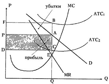 Величины Р и Q определяются по точке Е пересечения кривых МС и MR (в этой точке выполняется условие MR = МС. А значит, можно увидеть объем, при котором фирма максимизирует прибыль). Если точка А лежит ниже кривой АТС 2, то фирма несет убытки (прямоугольник PFBA), когда цена превосходит средние издержки на единицу продукции, фирма имеет прибыль (прямоугольник PACD).