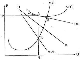 Приведенные на рис.45. D, АТС1, МС совпадают с соответствующими кривыми на рис.44, когда первоначально фирма имела экономическую прибыль. Это вызвало вхождение новых фирм в отрасль. Спрос на продукцию фирмы понизился, кривая D сместилась влево и стала более эластичной. Равновесие наступит, когда кривые Da и АТС1 будут соприкасаться в точке А.