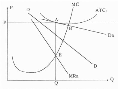 На рис.57 представлено равновесие фирмы, действующей в условиях монополистической конкуренции, в долгосрочном периоде /1/. Видно, что цена товара превосходит величину минимальных средних суммарных издержек ATC (точка А лежит выше точки В) и объем Q меньше, чем был бы выпуск при минимальных средних валовых издержках.