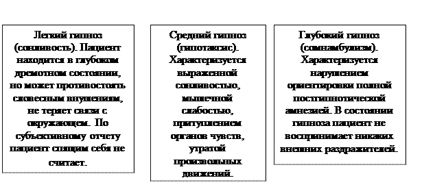 | Средний транс | Частичная амнезия Постгипнотическая амнезия Изменение личности Простые постгипнотические внушения Кинестетические иллюзии; полная амнезия | |