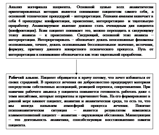 Классический психоанализ включает следующие основные этапы: продуцирование материала, его анализ и рабочий альянс.