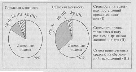 Из рис. 13.2 видно, что денежные доходы в городе составляют почти 9/10 всех валовых доходов, тогда как стоимость натуральных поступлений невелика (всего 7%). В сельской местности положение меняется. Доля денежных доходов меньше на 20 процентных пунктов, а стоимость натуральных продуктов достигает почти трети всех доходов. Различия имеют место и в накоплениях. В сельской местности население беднее, поэтому и накопления меньше.