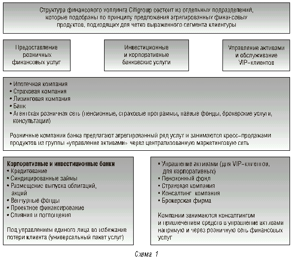 Одна из крупнейших в мире финансовых корпораций (Citigroup) представляет собой четко выстроенную структуру по двум главным принципам. Первый принцип — это диверсификация клиентуры банка. При четком выявлении клиента происходит диверсификация второго порядка — продуктового ряда (схема 1). Услуги подбираются для каждого сегмента клиентуры таким образом, чтобы один продукт был комплиментарным или альтернативным по отношению к другому.