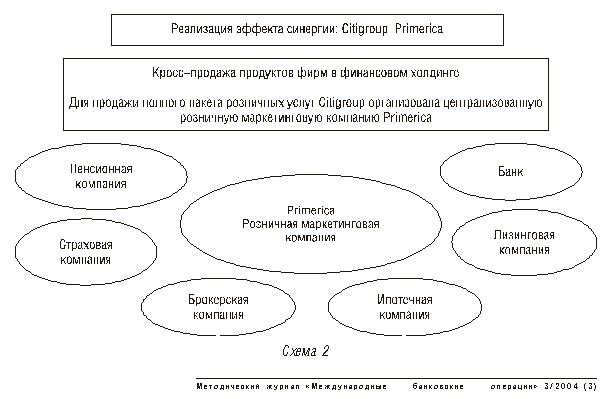 В Citigroup создана комиссия по синергии, где один руководитель может возглавлять одновременно несколько компаний, тем самым увеличивая их взаимодействие. К примеру, страховая и брокерская компании из группы «Управление активами» может находиться под руководством менеджера, возглавляющего также и розничную сеть Primerica, тем самым продвигая финансовые продукты через розничный сектор группы (схема 2).