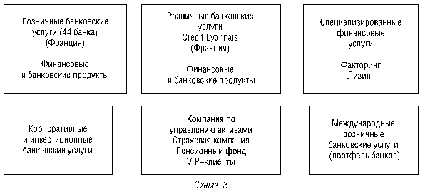 Финансовая группа Credit Agricole объединяет в себе множество банков во Франции и за ее пределами. Составлена по принципу портфеля (схема 3) с децентрализованной моделью управления, но с централизованными нормативами и продуктовым рядом. Прибыль в компании распределяется в зависимости от качества кредитного портфеля в каждом из банков. Многие из услуг предлагаются и интегрируются через сеть банков группы.