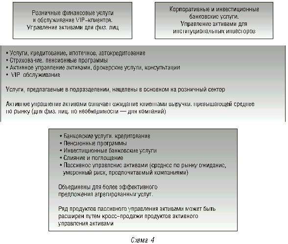 • розничные финансовые услуги и обслуживание VIP-клиентов; • управление активами для физических лиц; • корпоративные и инвестиционные банковские услуги; • управление активами для институциональных инвесторов.