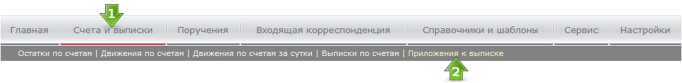 - Открыть пункт меню «Счета и выписки» (1), выбрать раздел «Приложения к выписке» (2);