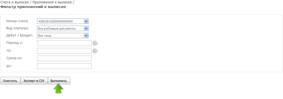 - В фильтре указать номер счета, вид платежа, период. Нажать на кнопку «Выполнить»;