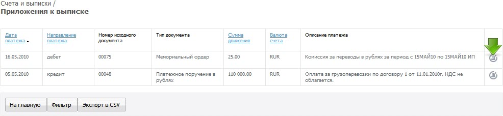 В списке окончательных движений доступны только основные данные платежей. Если необходимо распечатать первичный документ (например, платежное поручение, по которому на счет были зачислены средства) или просмотреть более детальную информацию по платежу, следует обратиться в раздел «Приложения к выписке».