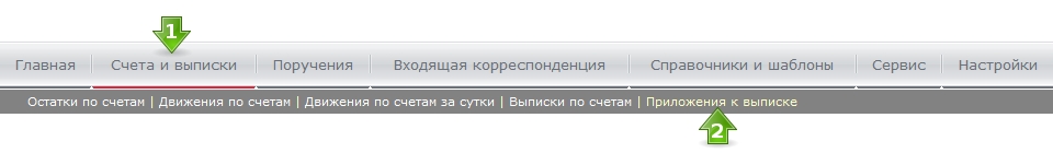 - Перейти к пункту меню «Счета и выписки» (1), выбрать раздел «Приложения к выписке» (2);