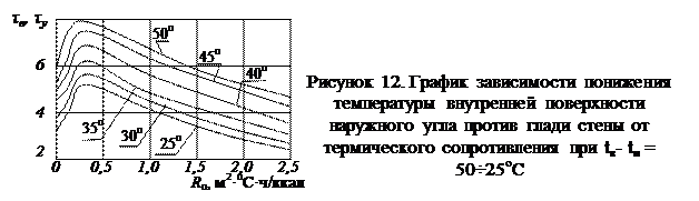 Снижение температуры поверхности в углах объясняется, во-первых, неравенством площадей тепловосприятия вследствие понижения интенсивности конвективных потоков. Температура внутренней поверхности ограждения в углу в общем случае может быть определена путем расчета температурного поля. Для наиболее часто встречающихся случаев эту температуру можно найти с помощью графика, построенного К.Ф. Фокиным (рис.12).