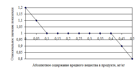 Пример 1. Исследуемые образцы продукции по результатам испытаний имеют следующие значения абсолютного содержания вредного вещества в них: 0,05; 0,20; 0,30; 0,35; 0,45; 0,50 мг/кг. Значения базового показателя – не более 0,5 мг/кг, т.е. имеем допустимый интервал – от 0 до 0,5 мг/кг. Зависимость между абсолютными и относительными значениями показателя представлена на рис.4.