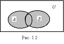 Определение. Объединением множеств A и B (обозначение A B) называется множество элементов x таких, что x принадлежит хотя бы одному из двух множеств A или B (рис 1.2). Символически это можно записать следующим образом: