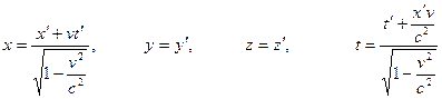 Релятивистские преобразования координат и времени, отражающие свойства пространства и времени в специальной теории относительности, называются преобразованиями Лоренца. Согласно этим преобразованиям переход от системы К` к системе К осуществляется по формулам (4.9), а от К к системе К` – по формулам (4.10)