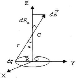 Разделим кольцо на элементарные (т.е. очень малые) участки dℓ так, чтобы заряд dq каждого такого участка можно было считать точечным. Тогда модуль напряженности dE поля, создаваемого выделенным (рисунок 2) точечным зарядом в точке