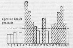 Эти реакции не контролируются волей, и поэтому всегда истинны. Результаты теста можно четко проиллюстрировать диаграммой (рис. 5). Высота колонок отражает время реакции на каждое слово. Штриховая горизонтальная линия показывает среднее время реакции. Белые колонки обозначают реакции без нарушений, а заштрихованные - нарушенные реакции, время которых превышает среднее. В реакциях 7-10 мы наблюдаем целую серию нарушений. Реакция 13 изолирована, но вслед за ней идет еще одна серия нарушений (16-20).