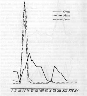 Рис. 7, Г не менее интересен. Две сестры живут вместе, одна из них замужем. Их пиковая реакция проходит под номером V. Жена в предыдущем случае - сестра этих двух женщин, и, возможно, все они принадлежат к одному типу, но она вышла замуж за человека иного типа. Их пик на рис. 7, В проходит под номером III.