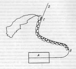 Сновидец знает, что должен отправиться на важную конференцию, и берет свой портфель. Замечает, что время поджимает, поезд скоро отойдет, и начинает суетиться, боясь опоздать. Он пытается собрать свою одежду: шляпы нет, пальто лежит на месте. Бегает по всему дому, в поисках того и другого, и кричит: «Где мои вещи?» В конце концов все находится, и герой выбегает из дому. При этом обнаруживается, что забыт портфель. Он возвращается за портфелем и смотрит на часы, убеждаясь в том, что действительно опаздывает. Затем бежит на станцию по дороге, которая до странности настолько мягкая, что будто бежишь по мху, и ноги двигаются с большим трудом. Задыхаясь, наш герой прибегает на станцию и видит, что его поезд только что ушел. Тут его внимание привлекает железнодорожное полотно, которое выглядит примерно как на рис. 8. Сновидец находится в А, хвост поезда уже в В, а паровоз в С. Он наблюдает за составом, огибающим всей своей длиной кривую, и думает при этом следующее: «Если машинист достаточно умен, то сообразит, подойдя к точке D, не давать полный пар, так как если он это сделает, то длинный состав, все еще огибая кривую, сойдет с рельс». Паровоз подходит к D, и машинист дает полный пар: паровоз резко тянет состав вперед. Сновидец видит разворачивающуюся катастрофу - состав сходит с рельс - и кричит, просыпаясь в кошмарном страхе.