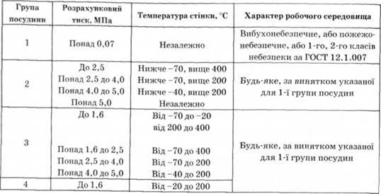 Таблица 6.1. Группа посудив за расчетным давлением