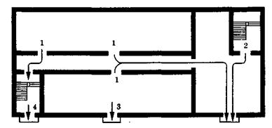 1 - выход из помещения в коридор, который ведет сквозь вестибуль или лестничную клетку непосредственно наружу; 2 - выход из лестничной клетки сквозь вестибуль наружу; 3 - выход из помещения непосредственно наружу; 4 - выход из лестничной клетки непосредственно наружу