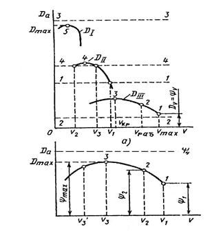 1. Если линия ψ пересекается с кривой D (11-D11); то максимальная скорость равна υ1, т.к. при этой скорости соблюдается условие D=ψ - рисунок 6а.
