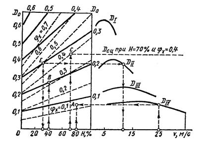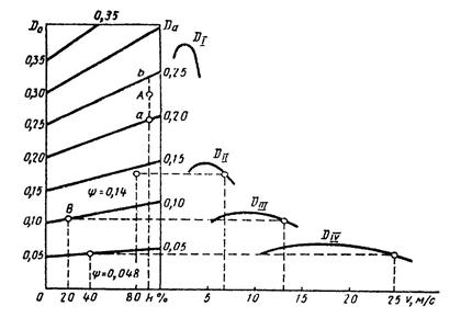 Пусть заданы нагрузка H = 80 % и ψ = 0.14. Проведя вертикальную линию через заданное значение H, отложим на ней величину ψ и проведем через полученную точку горизонтальную линию до пересечения с кривой D. Абсцисса точки их пересечения и будет представлять собой искомую скорость, равную 25 км/ч (