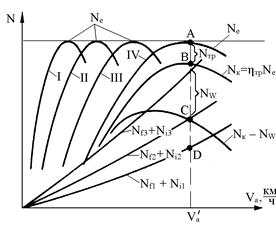 Для анализа динамических свойств автомобиля, можно вместо соотношения сил использовать сопоставление тяговой мощности Nк с мощностью, необходимой для преодоления сопротивления движению. Аналогично тяговому балансу можно записать и мощностной баланс автомобиля и трактора (для общего случая движения): Ne=Nтр+Nѓ+Ni+Nw+Nкр+Nj+Nδ+Nпр+N вом (70)