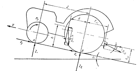 Продольная устойчивость колесных машин нарушается, если под действием внешних сил и моментов передние или задние колеса начинают отрывается от грунта, т.е. или z1=0 или z2=0 - рисунок 15.
