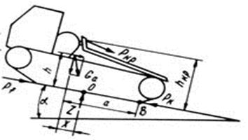 Продольная устойчивость гусеничных машин обычно оценивается величиной смещения точки D, так называемого центра давления гусениц - рисунок 15б. Когда трактор неподвижен на горизонтальном участке и Pкр=0, и Gгр=0, точка D находится на линии действия силы Gт, т.е. под центром тяжести. При движении машины равнодействующая нормальных реакций дороги, под действием внешних сил и моментов смещается вперед или назад от центра тяжести.