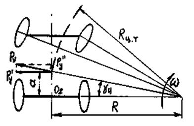 Разложим силу Ру на две составляющие: продольная вызывает перераспределение нормальных нагрузок между передними и задними колесами, поперечная составляющая стремится опрокинуть машину - Р′у. Величина Р′у определится: Р′у=Ру∙Cosγц=(G∙ω2∙Rцт)/g∙Cosγц=G∙ν2/(g∙R), (115)