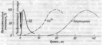 Рис. 5. Схема временной последовательности развития потенциала действия (ПД), освобождения ионов кальция (Са2+) и развития изометрического сокращения мышц.