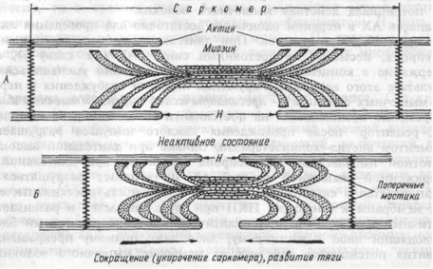 Рис. 6. Сокращение мышцы. А – Поперечные мостики между актином и миозином разомкнуты. Мышца находится в расслабленном состоянии. Б – Замыкание поперечных мостиков между актином и миозином. Совершение головками мостиков гребковых движений по направлению к центру саркомера. Скольжение актиновых нитей вдоль миозиновых, укорочение саркомера, развитие тяги.