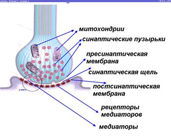 3) синаптическая щель (пространство между пресинаптической и постсинаптической мембраной, заполнена жидкостью, которая по составу напоминает плазму крови).